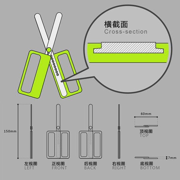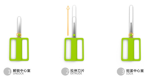 这是一把神奇的剪刀,设计师巧妙的将杆杠原理附在这把剪刀上。当您要剪一些粗麻布,编织物的时候,是否想要更强的力道的剪刀呢?这时,只要我们分三步调节,它立刻就变成了短而有力的短剪刀;而当我们要剪一般纸类、包装袋、一般印刷品或者做一些细致的手工活时,是否想要更好稳定性的剪刀呢?同样,三步,马上变成长剪刀,保证是您剪直线的最佳选择。怎么样?是不是很神奇呢?