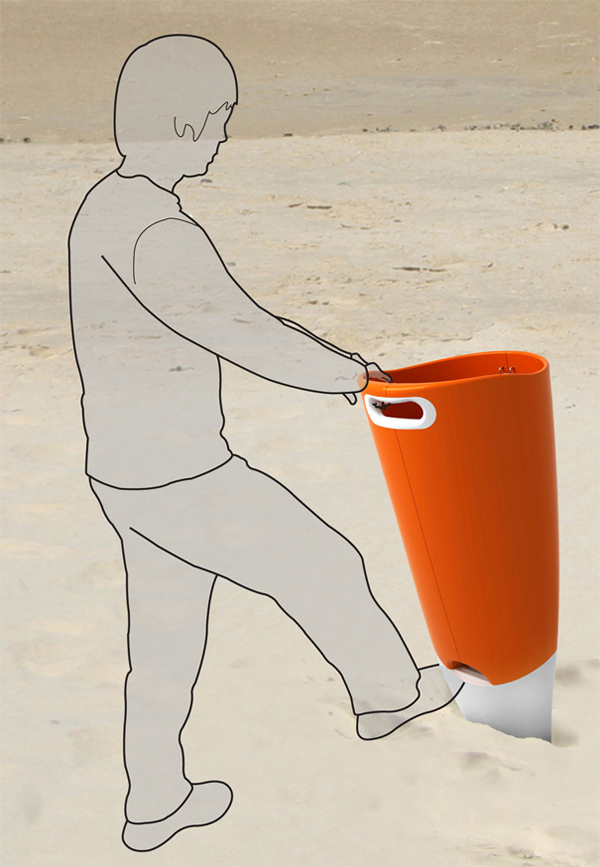 环保并不需要什么新鲜玩意,许多人也许会觉得,想保持沙滩的整洁干净而扔放垃圾时却不能轻易地找到垃圾桶。下面的这个是设计师们设计出此款沙滩垃圾桶。但凡有沙的地方即可放置,且方便携带,可按需求选择垃圾桶放置的地点和数量,又不必拘泥于古板形式。让这些垃圾桶多多放置在沙滩上,对保持沙滩的整洁也许能作出一定的贡献。设计师:Ji-in Byun, Cho Jung Seok 和Oh Seul Ki。