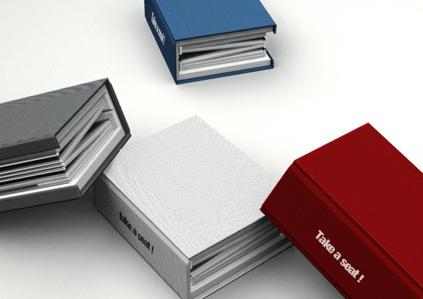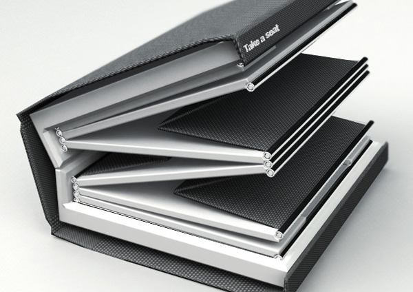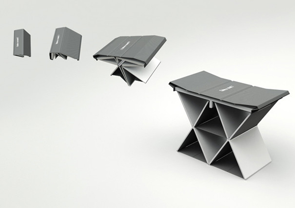 不要以为你看到的是一本书,其实它是一个凳子。独特的可折叠的书本凳子,外壳由橡木板制成,内部为金属支架构造成三角形,十分稳固。在折叠起来的时候,完全就是一本书的样子,甚至可以装到书架里去。展开来就是一张凳子。在出去Outing的时候带上这样的一个新奇特产品,即节约空间又方便使用。设计师:Darris Hamroun