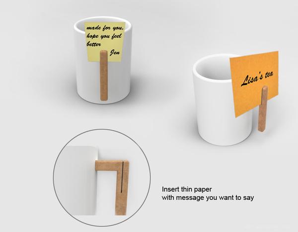 何为“对杯”,恐大家一时难得其解。对杯,顾名思义。其实就是可以相互对话的杯子,那么他们如何对话呢?设计师通过一个简单的夹扣设计,让杯子多了一个可以夹便条的功能,如果大家在等朋友或临时有事要先走,可以留下便条在这个新奇的杯子上,非常的方便。这个设计来自于Jinyi Su,她是一名学生,她说:我享受设计的乐趣,我享受我生命的一部分,就是这样。