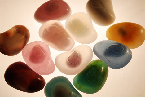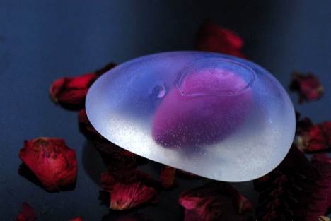 这些香皂看起来非常的晶莹剔透,记得有一次在龙德广场里边看到过一个商家在推销过相关的产品,气味非常的香,而且有许多不同水果味道的,起初还以为是可以吃的东西。这些香皂是由Yoon Kuk Hyun设计的,它们的样式就如琥珀一般,在香皂的里边还蕴含了一个另外的礼物,也许是石头也许是其它的东西,想看看它一点点的消耗掉里边究竟是什么吗?