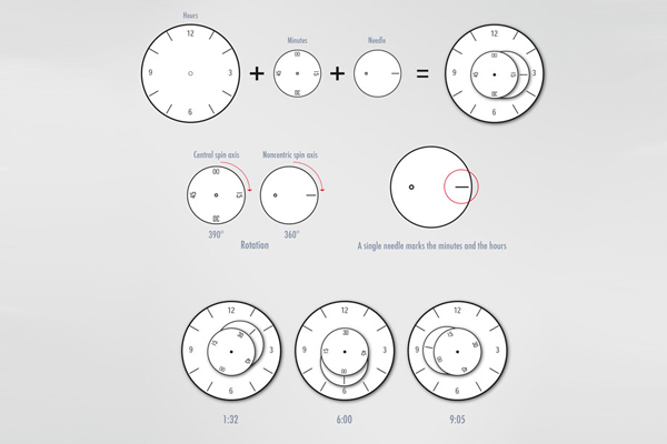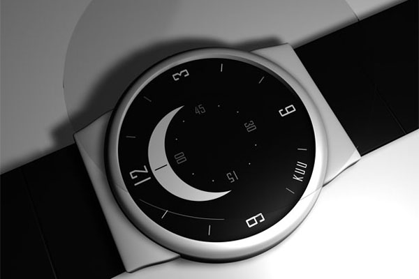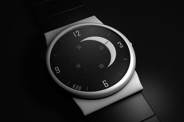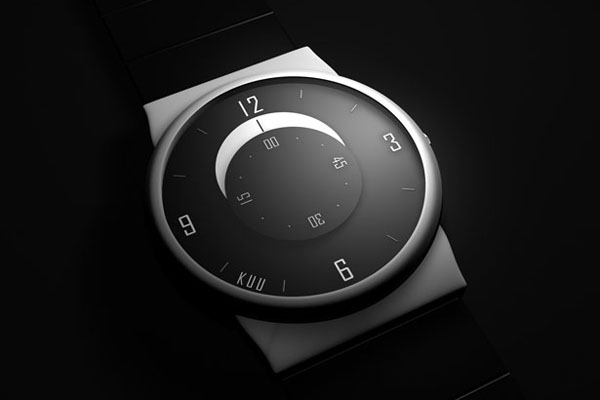 在之前多新奇也曾经介绍过许多创意设计的表盘手表。KUU手表由三个圆盘组成,包括黑色的时钟、分钟盘和白色的指针盘,其中时钟盘是固定的,分钟和指针随着中央自转轴旋转,并用白色的指针来同时标记当前的小时和分钟,设计构思巧妙、现代时尚,三个圆盘之间不论如何转动,经典的黑与白之间总会构成一个像月亮般的图案,非常漂亮。