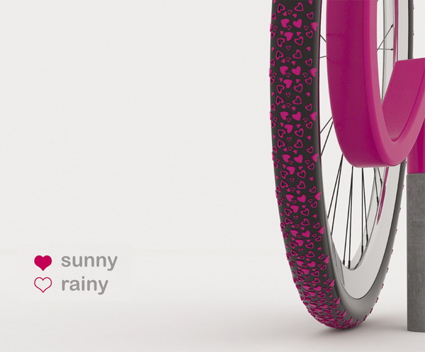 多新奇觉得,这个轮胎更像是一个概念产品的说。它与其它的轮胎不同之处在于,他的轮胎印上面充满了爱心的印记,在车子的轮胎在平面压过后就会留下一连串的爱心,非常的浪漫。不过这车可以看来很是浪漫,不用真正用的时候还是要看车子的本身和它的防滑效果才更加重要。不过,喜欢的朋友可以买回来放在自己家的屋子里来回骑,哈哈。