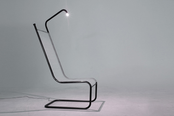 这个看似简单的椅子实际上有着一个不简单的功能,相信你没见过椅子上还带有灯的吧,这个椅子就有,而且还隐藏的很深呢,从表面看需要将椅子上面的靠背横杆掰动才可以看的到,设计师用了一个很巧妙的创意设计为我们带来了一个可以在夜晚的时候坐在椅子上看书的新奇家居。 同时这种简单的设计也会让你坐在上面的时候感受一份额外的安静。