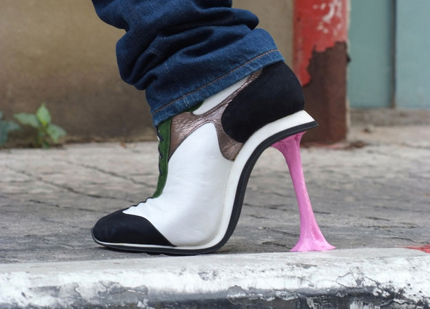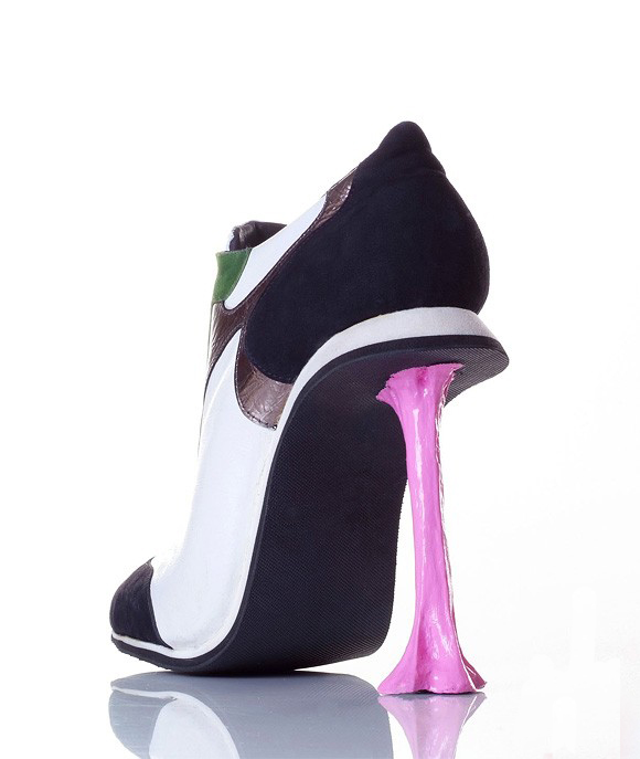下面给大家介绍的是一个高跟鞋,但不是一般的高跟鞋,它下面踩着口香糖呢,各位同学想不到口香糖居然能和鞋子联系起来。今天就这么神奇的出现了。我想灵感应该来自于这位设计师被口香糖黏住的经历。看起来是那么的形象,好逼真啊,哈哈。